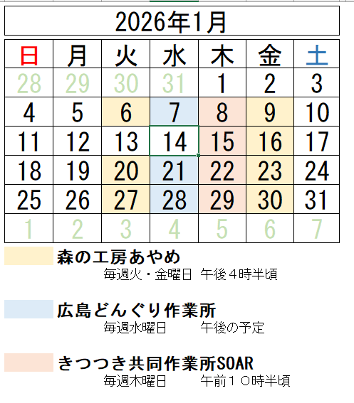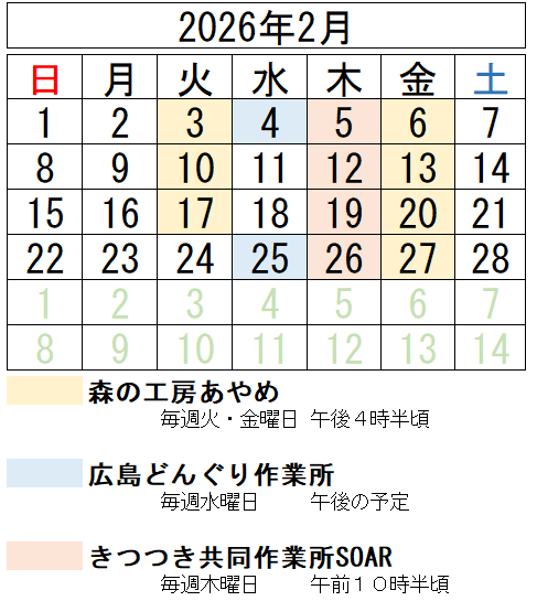 | 施設名 | きつつき共同作業所SOAR | 森の工房あやめ | 広島どんぐり作業所 |